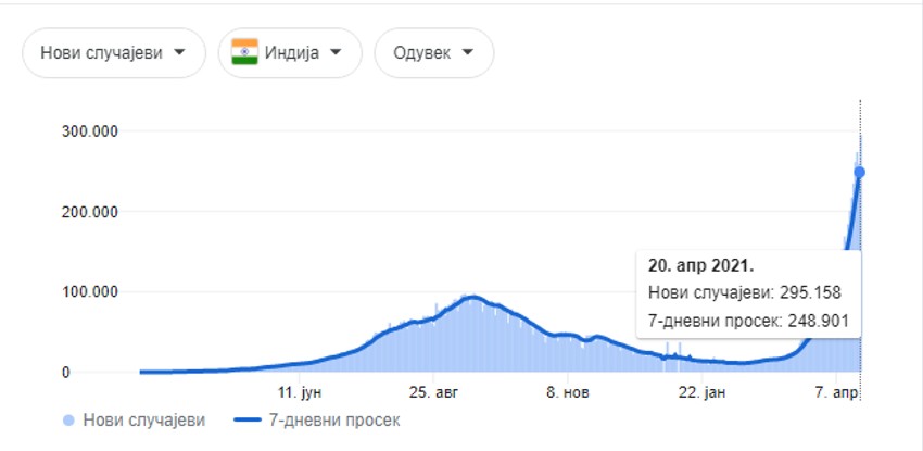 Indija sada beleži više od 250.000 novih infekcija dnevno i ako se trenutni trendovi nastave, ta brojka bi mogla da se popne na 500.000 u roku od mesec dana, upozoravaju epidemiolozi. Samo u sredu u zemlji je prijavljeno skoro 300.000 novozaraženih i rekordnih 2.000 smrtnih slučajeva.