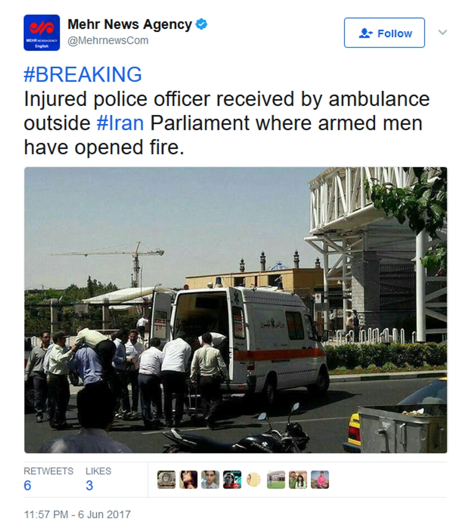 U parlamentu Irana došlo je do pucnjave u kojoj je povređeno nekoliko ljudi, dok je na drugom kraju grada, u mauzoleju imama Homeinija došlo je do druge pucnjave i eksplozije. Žrtva ima u oba napada, a odgovornost je preuzeo ISIS.