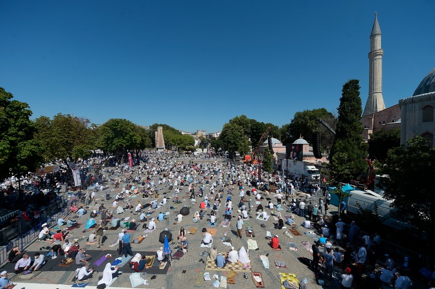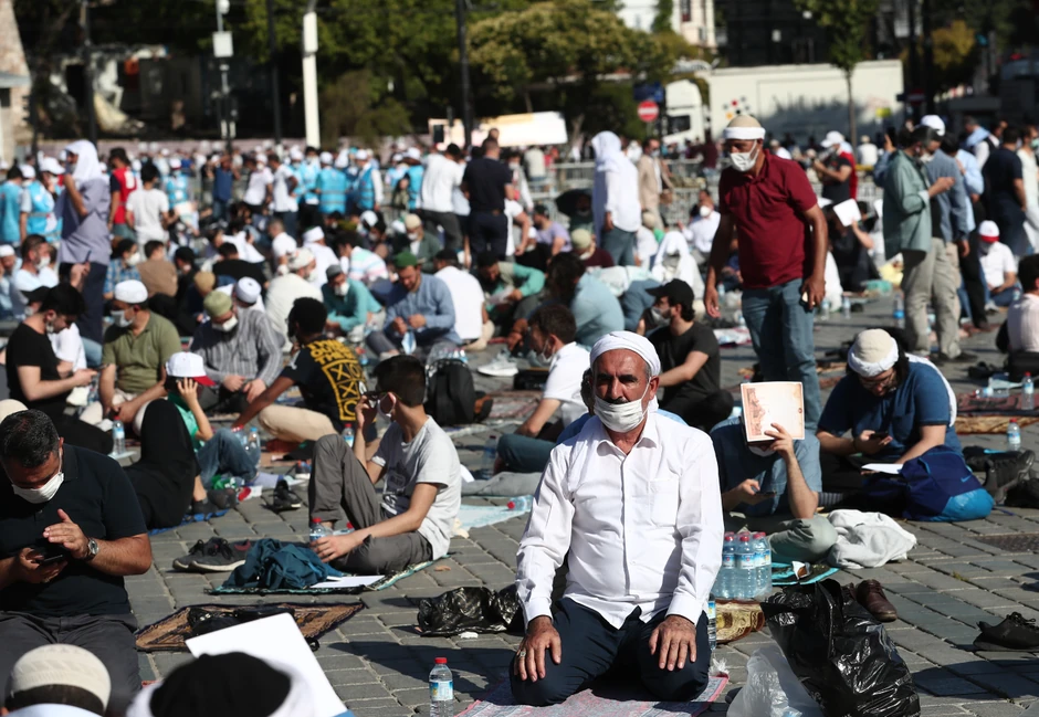 Zbog pandemije korona virusa ograničen je broj vernika. U Aju Sofiju moglo je da uđe njih 500, dok su ostali, kako se procenjuje nekoliko hiljada njih, ispred građevine. Predviđeno je da se molitva obavi u pet zona na otvorenom, tri za muškarce i dve za žene