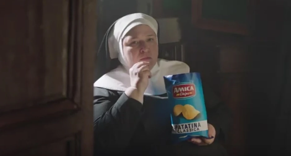 Reklama za Amika Čips, koji je popularan u Italiji, dešava se u manastiru i počinje tako što se časna sestra sprema da primi pričest.