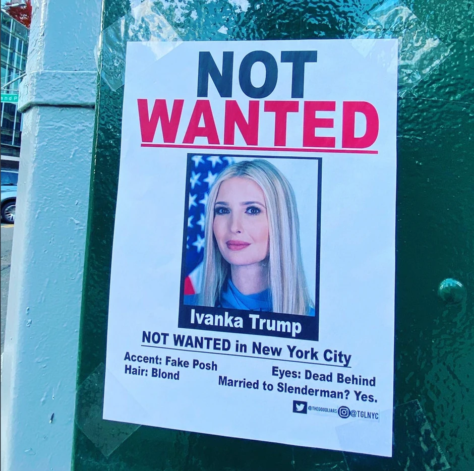 Plakati iza kojih stoje Džejson Selvig i Devram Stigler, komičarski duo poznat kao „Dobri lažovi“, podsećaju na poternice sa Divljeg zapada. U njima ismevaju Ivanku zbog „izveštačenog otmenog“ naglaska, a njenog supruga Džareda Kušnera porede s virtuelnim likom „Slendermenom“.