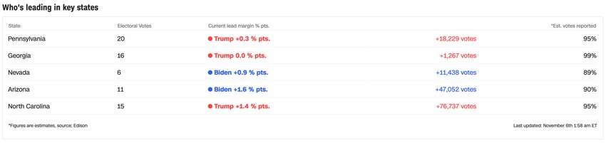 Bajden je povećao prednost u Nevadi, ali je ona smanjena u Arizoni za više od 50.000 glasova. U Džordžiji je najnapetija situacija, budući da Tramp vodi sa nepunih 2.000 glasova. Bajden mora da zadrži prednost u Nevadi i Arizoni da bi pobedio, dok su Trampove šanse manje ali svakako postoje. Potrebno mu je da zadrži prednost u Severnoj Karolini i Pensilvaniji (razlika svega 0,7 odsto), ali uz te države da osvoji i Džordžiju i Nevadu ili Džordžiju i Arizonu.
