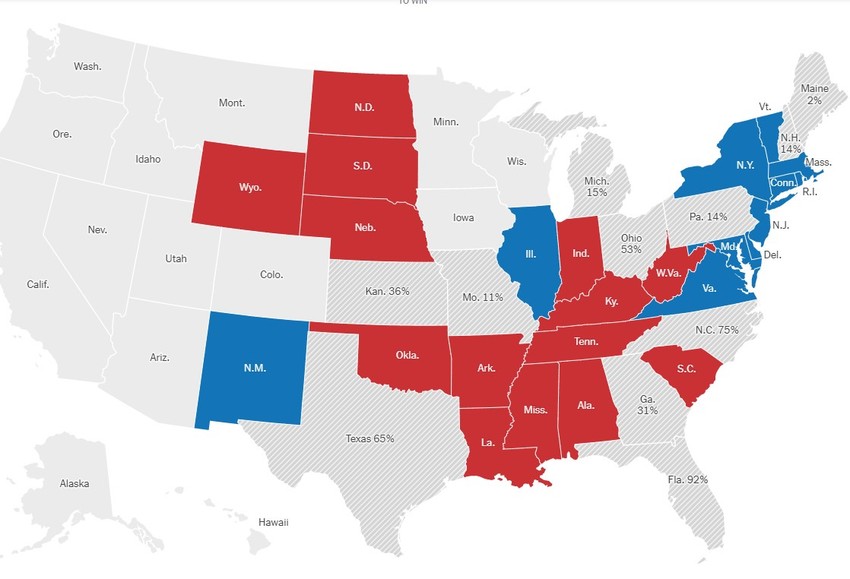 Njujork tajms predviđa pobedu Bajdena u Ilinoisu, Virdžiniji, Merilendu, Nju Džersiju, Konetikanu, Masačusetsu i Vermontu. Prema njihovim projekcijama Tramp vodi u Oklahomi, Arkanzasu, Misisipiju, Alabami, Severnoj Karolini, Tenesiju, Kentakiju, Zapadnoj Virdžiniji.