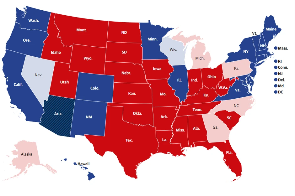 Ohajo i Florida su "kolebljive" ili sving države što znači da se do sada pokazalo da ne favorizuju posebno ni republikance ni demokrate. Lome se koplja i u Teksasu. Prema nekim prognozama, ova država će takođe moći da se svrsta u krug neopredeljenih, "kolebljivih" država iako je do sada bila čvrsto uporište republikanaca. Tako da bi pobeda Bajdena u Teksasu bila veliko iznenađenje.