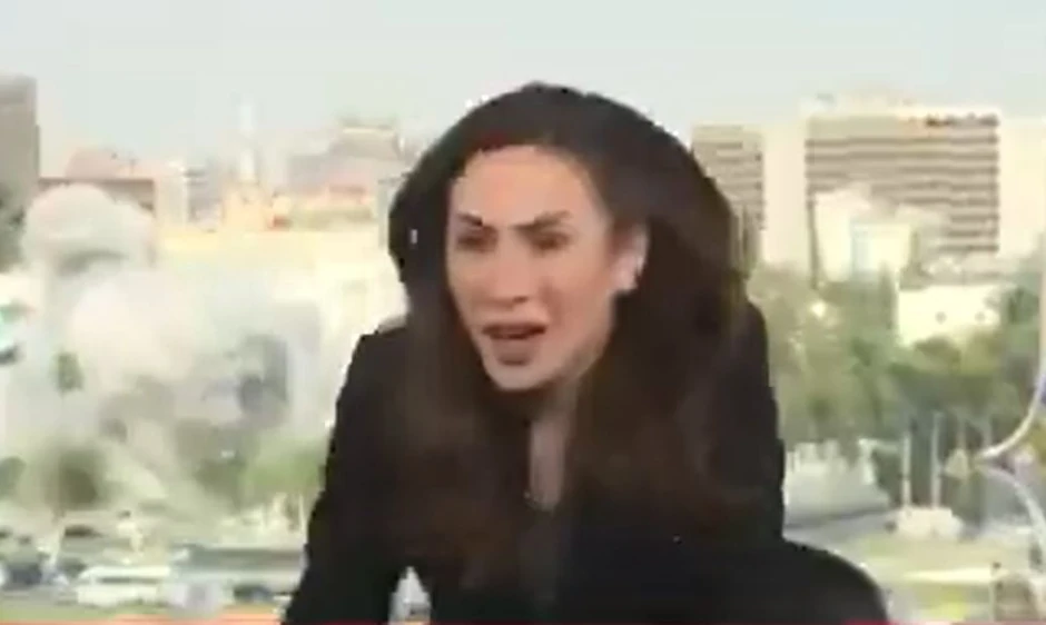 Video-snimak sirijske televizije prikazuje kako je zgrada sirijskog Ministarstva odbrane pogođena u etru, što je primoralo voditeljku da se skloni.