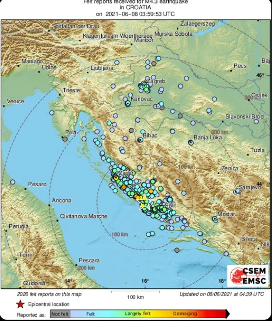 Jak potres s epicentrom oko 13 km jugoistočno od Šibenika u Hrvatskoj, zabeležen je jutros u 5 sati i 59 minuta.
