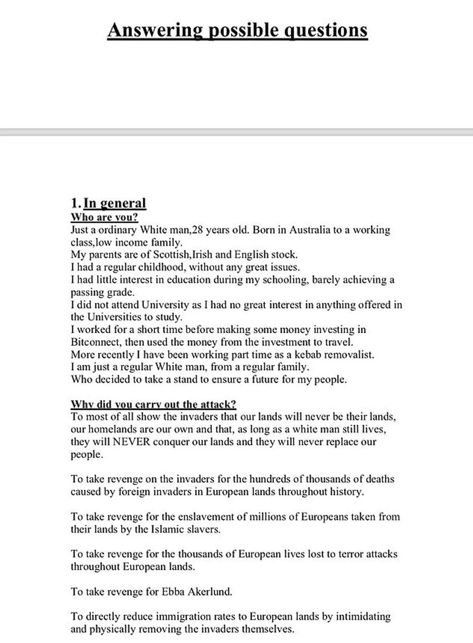 U drugom delu manifesta gde daje odgovore na pitanja za koja “pretpostavlja da će ljudi želeti da znaju o njemu”, poput zbog čega je to uradio, ko je uticao na njega i slično, sebe predstavlja kao “običnog belog čoveka” koji je “odlučio da zauzme stav da bi osigurao budućnost svog naroda”.