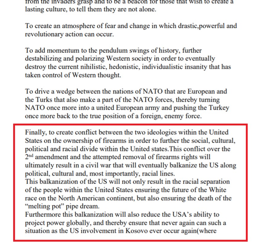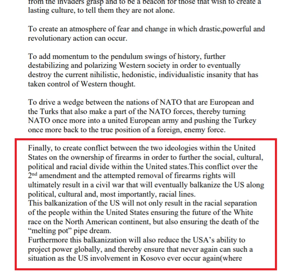 Među razlozima navodi i da će podstaći "okršaj između evropskih naroda u NATO i Turaka" i ponovo "okrenuti NATO da ujedini evropsku vojsku i odbaci Tursku, koja je neprijateljska sila". Zatim, Tarant piše o "balknanizaciji SAD".