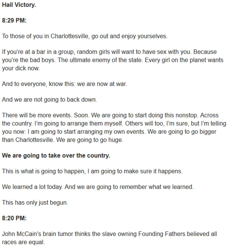 - Svi znajte ovo - mi smo sada u ratu. I nećemo se povući. Biće još događaja, uskoro. Počećemo ovo da radimo non-stop, širom cele zemlje. Lično ću da ih organizujem, ali će i drugi, siguran sam. Ali sada vam kažem, počeću da organizujem svoja okupljanja. Bićemo veći od Šarlotsvila. Bićemo ogromni - napisao je urednik bloga.
