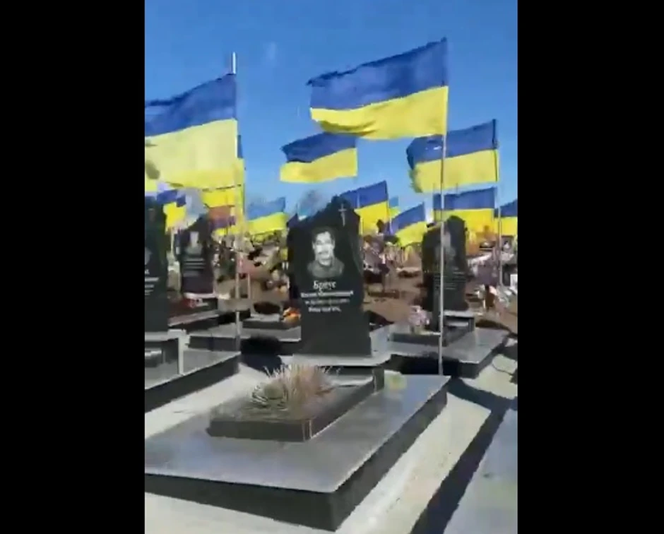 Video snimljen iz automobila koji prolazi pored groblja prikazuje sumorni, skoro beskrajni niz raka sa poređanim plavo-žutim zastavama koje se vijore iznad njih, kao svedočanstvom užasnih posledica krvavog rata.