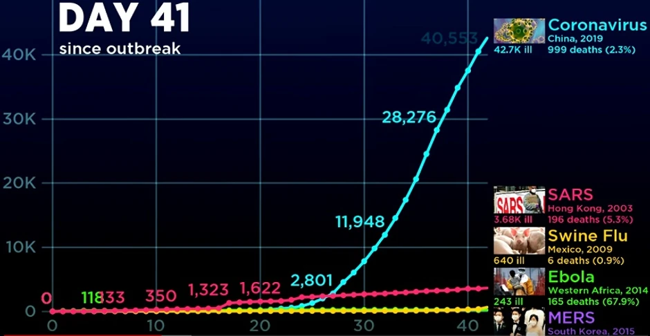 Tako se vidi da se ispočetka virus korona širio sporije od ebole, SARS-a i svinjskog gripa. Ali, 41. dana od izbijanja epidemije, bilo je 243 obolelih od ebole, 182 od MERS-a, 520 od svinjskog gripa, a 3.600 od SARS-a. U poređenju s tim, 41. dana od izbijanja epidemije korona virusa, 12. februara, bilo je više od 41.700 zaraženih u svetu.