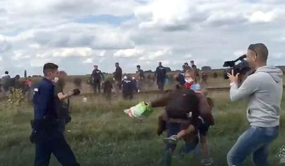 Na snimku koji je izazvao globalnu negativnu reakciju javnosti vidi se kamermanka, koja sapliće i šutira migranta sa detetom u naručju dok beži od policije u blizini mesta Reske blizu granice sa Srbijom.
