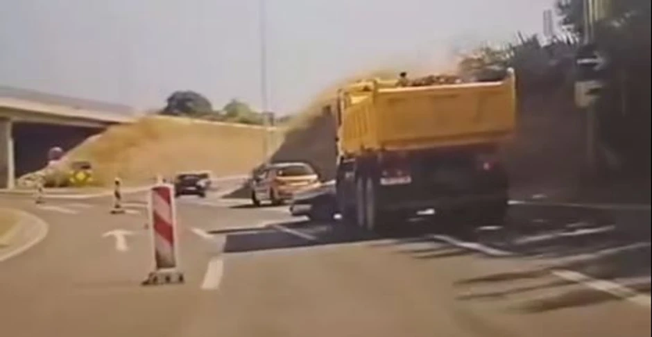 Na snimku se vidi da je vozač žutog kamiona, nakon što je udario u drugi automobil, nastavio da gura vozilo ulicom ka Kaštelima, umesto da zaustavi kamion.