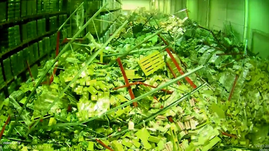 Zatim se na snimku vidi i kako se police iza takođe ruše. Nije poznato u kakvom su stanju radnici koje su bili zatrpani u ovom incidentu.