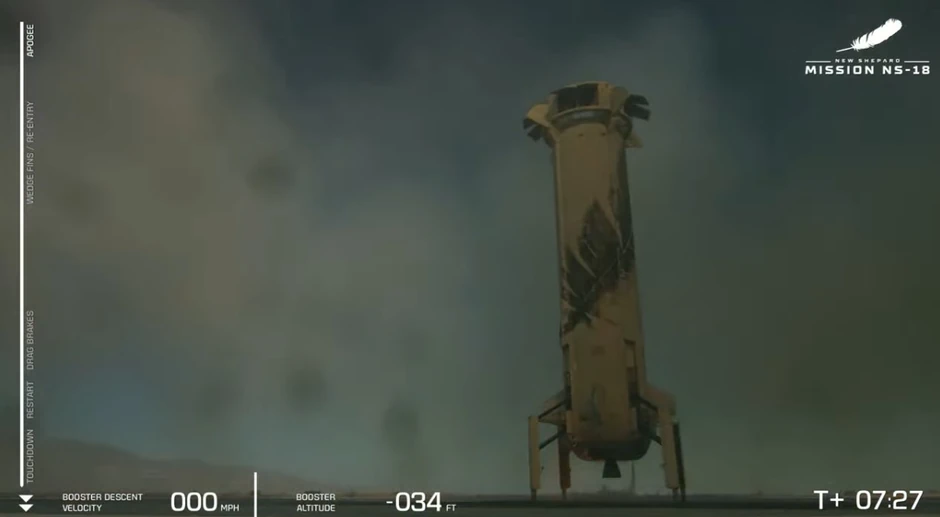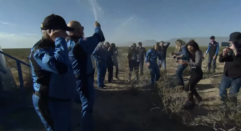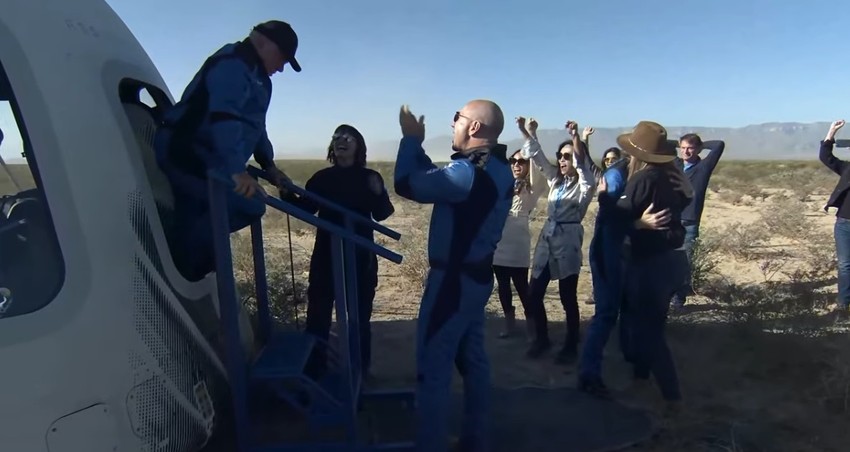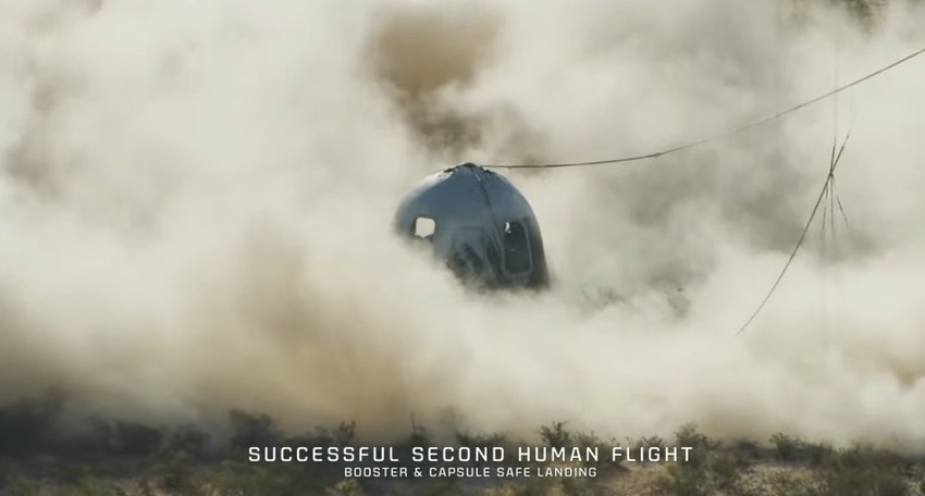 Ova kompanija je imala uspešan debitantski let u svemirskom turizmu 20. jula, sa Bezosom i još tri osobe koje su letele do ruba svemira i nazad tokom putovanja koje je trajalo 10 minuta i 10 sekundi. Na tom letu, avijatičarka Voli Fank (82) postala je najstarija osoba koja je stigla u svemir.