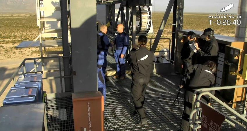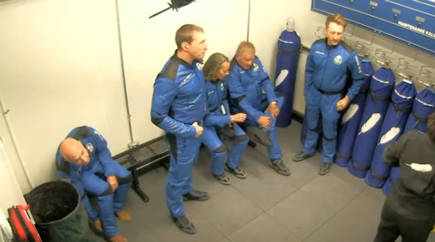 Šatneru se, na putovanju koje bi trebalo da traje oko 10 minuta, pridružio bivši inženjer NASA Kris Bošuizen, suosnivač platforme "Medidejta solušens" za klinička istraživanja Glen de Vries i potpredsednica i inženjer "Blu Oridžina" Odri Pauers.
