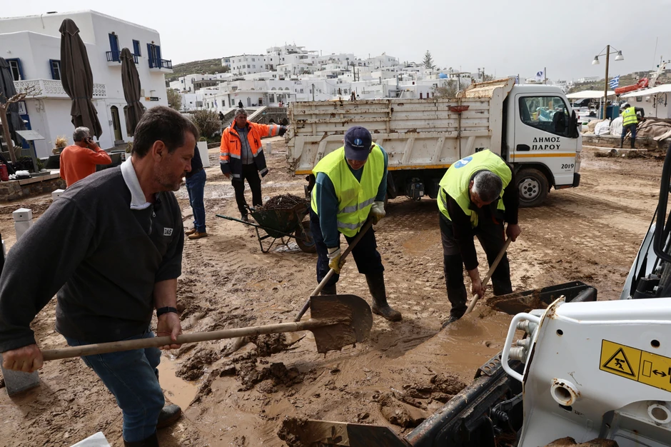 Na Parosu i Mikonosu vlasti su angažovane na uklanjanju prevrnutih automobila i krhotina nakon jakih pljuskova i grada. Oluje su u ponedeljak izazvale poplave na Parosu. Lokalni zvaničnici zatražili su hitnu pomoć vlade za sanaciju puteva i infrastrukture.