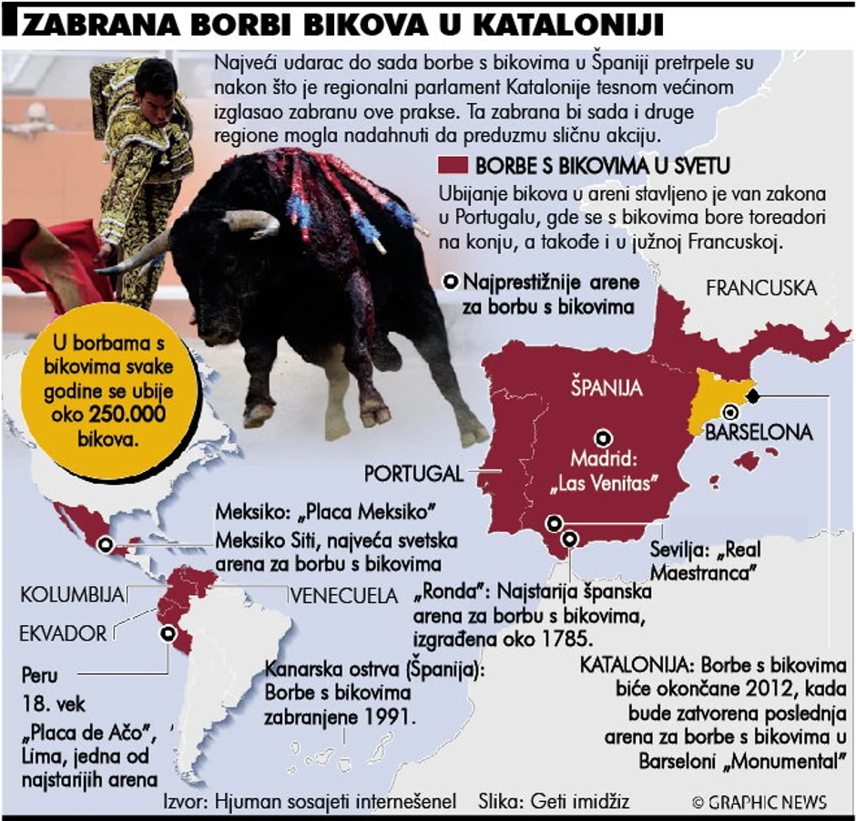 Turisti koji posećuju Barselonu imaće priliku da vide koridu u jedinoj preostaloj areni u celoj Kataloniji samo do 1. januara 2012. Tada će na snagu stupiti juče izglasani zakon kojim se u ovoj autonomnoj pokrajini zabranjuje borba s bikovima.
