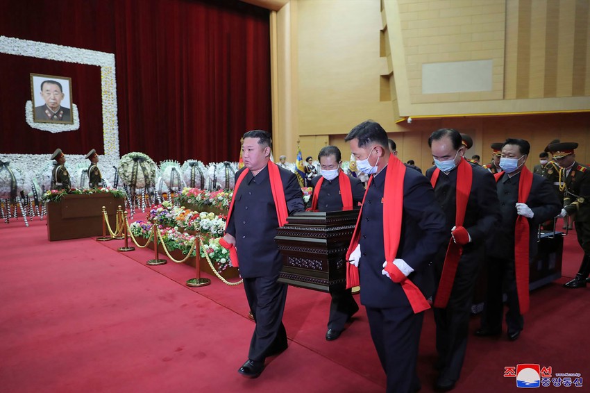 Kim je izneo kovčeg iz sale za komemoraciju, zajedno sa članovima predsedništva i političkog biroa Centralnog komiteta partije, a bacio je i zemlju u grob preminulog.