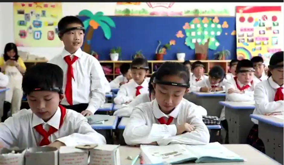 - Crveno označava duboku koncentraciju, belo znači da si "oflajn" - objašnjava učenik. On i njegovi drugovi iz razreda nose neku vrstu futurističkog rajfa na glavi. Mala LED lampa na sredini uređaja menja boju zavisno od nivoa koncentracije. Svakih deset minuta izmereni podaci šalju se na nastavnikov računar.