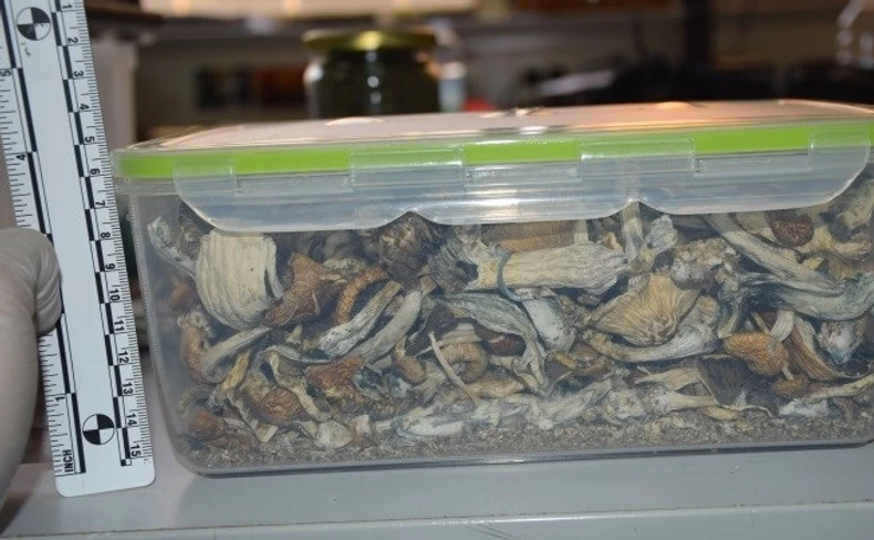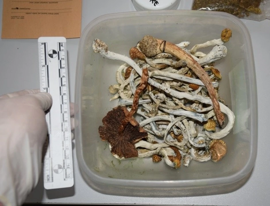 U pretrazi su našli 398,2 grama marihuane spakovane u dve tegle i tri paketića. Uz to, imao je i 25 grama ekstrakta konoplje zatvorene u tri plastične kutijice, te dve ručno motane cigarete ispunjene smesom duvana i konoplje. U jednoj vrećici imao je tabletu ekstazija, no ipak su posebnu pažnju privukle sušene halucinogene pečurke. Gotovo 404 grama bilo je raspoređeno u plastičnim kutijama, a prema fotografijama koje su objavili, imao je i dva paketića u kovertama koje su najverovatnije bile namenjene drugima.