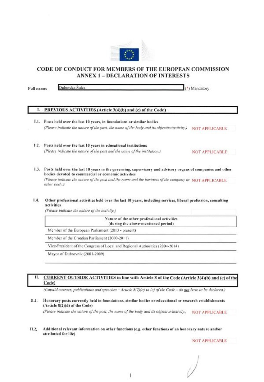 Uoči saslušanja pred odborima Evropskog parlamenta kandidatkinja za potpredsednicu Evropske komisije Dubravka Šuica objavila je izjavu o finansijskim interesima, piše N1.