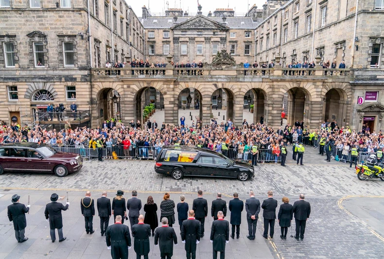 Kovčeg sa kraljevskom zastavom i krunom postavljen je u Vestminsterskoj dvorani, a tokom večeri pored njega su stajali kralj Čarls Treći i njegova braća i sestre.