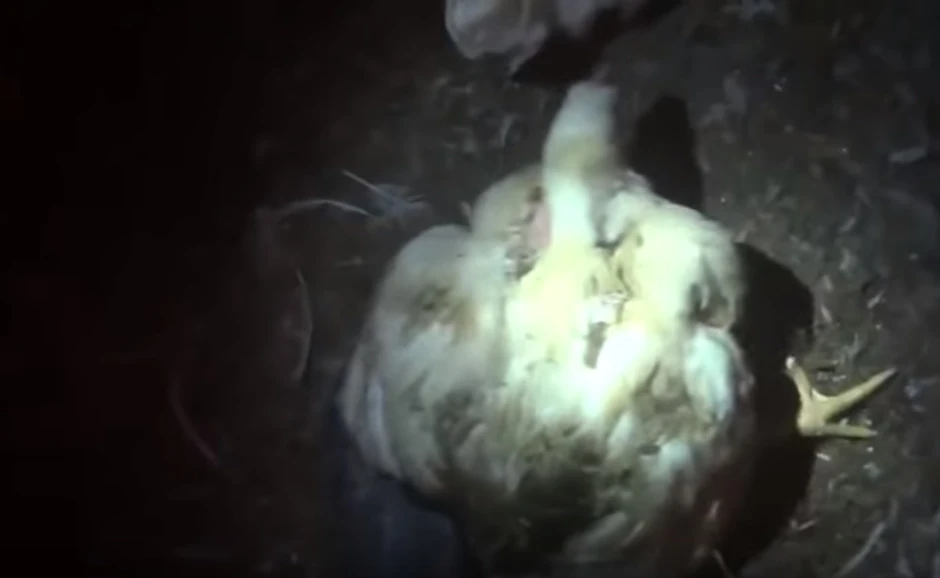 Desetine hiljada džinovskih “Frankneštajnovih pilića” nagurano je u velika skladišta. Životinje, koji dostižu težinu od četiri kilograma, padaju pod sopstvenom težinom i nemaju prirodnu svetlost. Često uginu pre nego što odrastu i ostaju da leže prekrivene sopstvenim izmetom, pretvarajući skladišta u leglo izazivača bolesti.