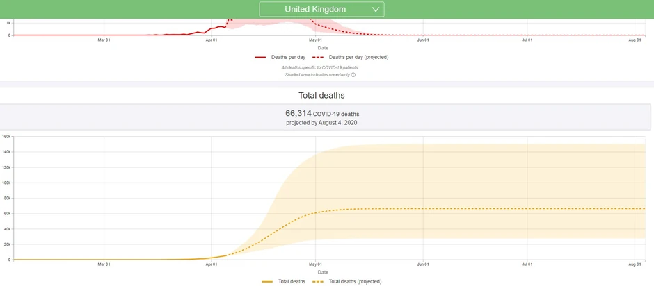 Na primer, IHME modeli predviđaju da će do 4. avgusta Velika Britanija imati ukupno 66.314 smrtnih slučajeva - što je prosek uzet u velikom rasponu između 14.572 i 219.211 smrti, što ukazuje na to koliko brojke mogu da variraju.