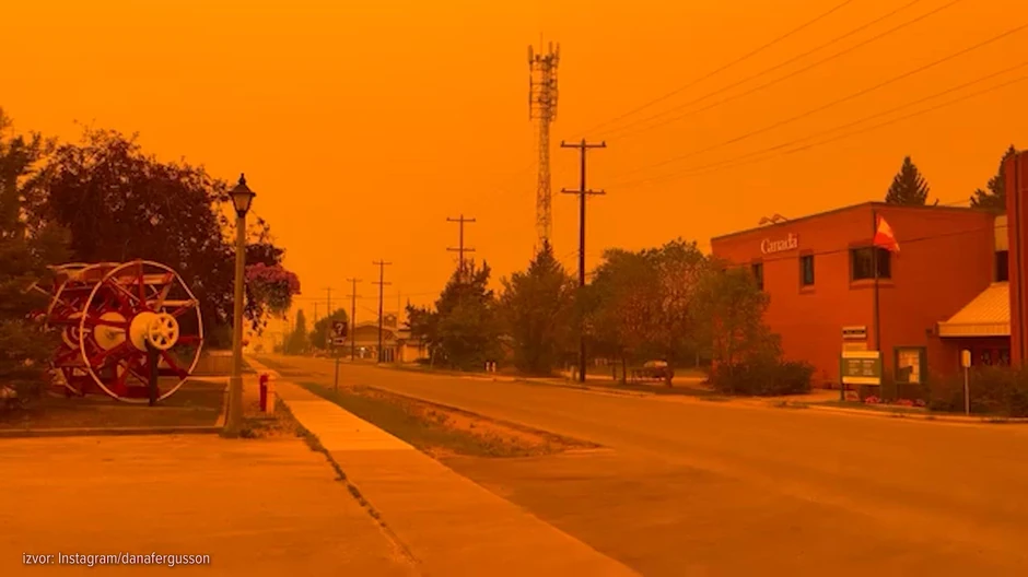 Kakva je zaista situacija na krajnjem severu Kanade pokazuje video Dejne Ferguson iz mesta Fort Smit. Na snimku je grad "obojen" u krvavo crvenu boju usled požara.