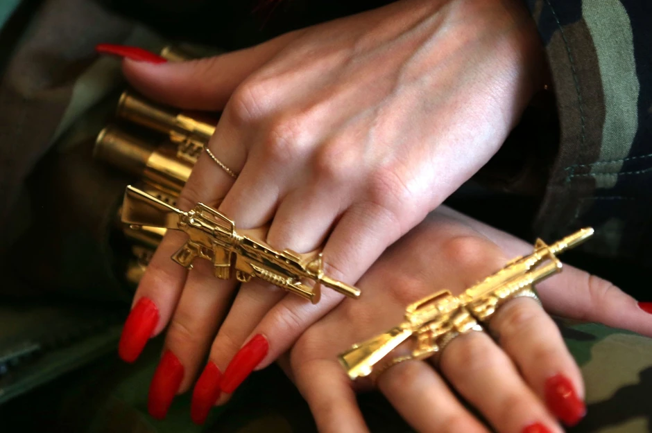 Zlatno prstenje u obliku oružja, zastave SAD, Nemačke, Iraka i Turske ušivene na kamuflažnu uniformu način su da provocira Islamsku državu i druge terorističke organizacije.