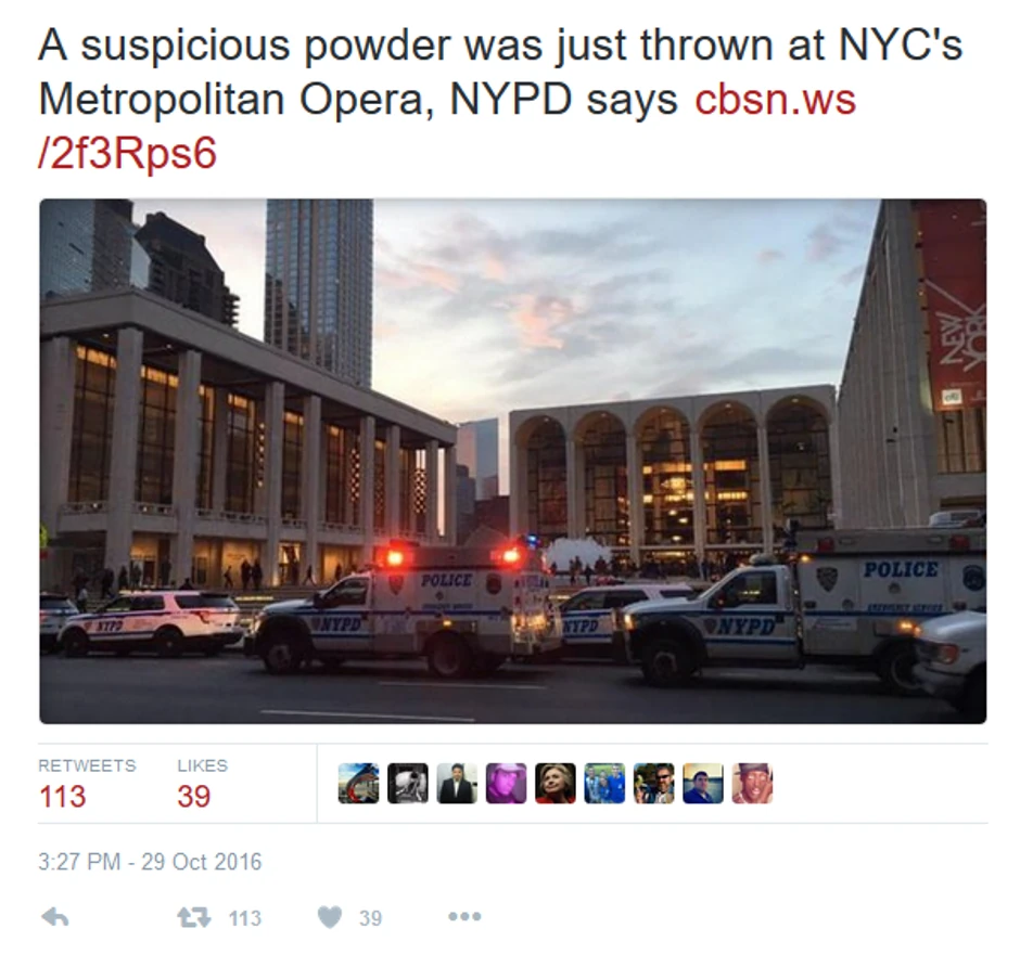 Praškasta materija koju je jedan čovek posuo u odeljak za orkestar u Metropoliten operi u Njujorku, što je izazvalo zabrinutost, možda je pepeo jednog ljubitelja opere, saopštila je danas američka policija.