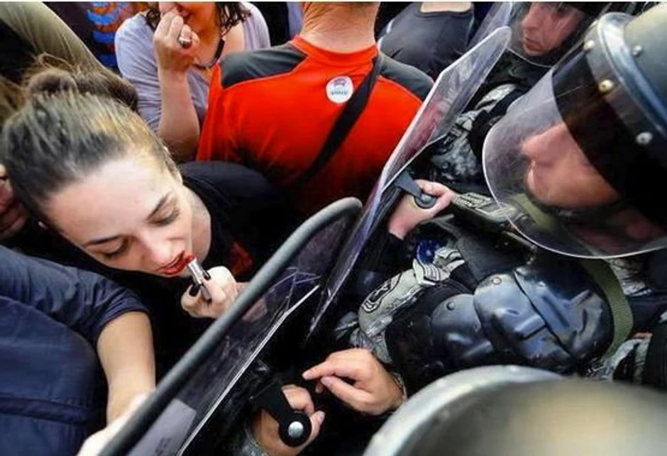 Dok je oko 1.000 ljudi neprestano protestovalo, jedna Makedonka, koja se nalazila u "prvim borbenim redovima" tik uz policijski kordon, odlučila je da napravi pauzu i popravi šminku.