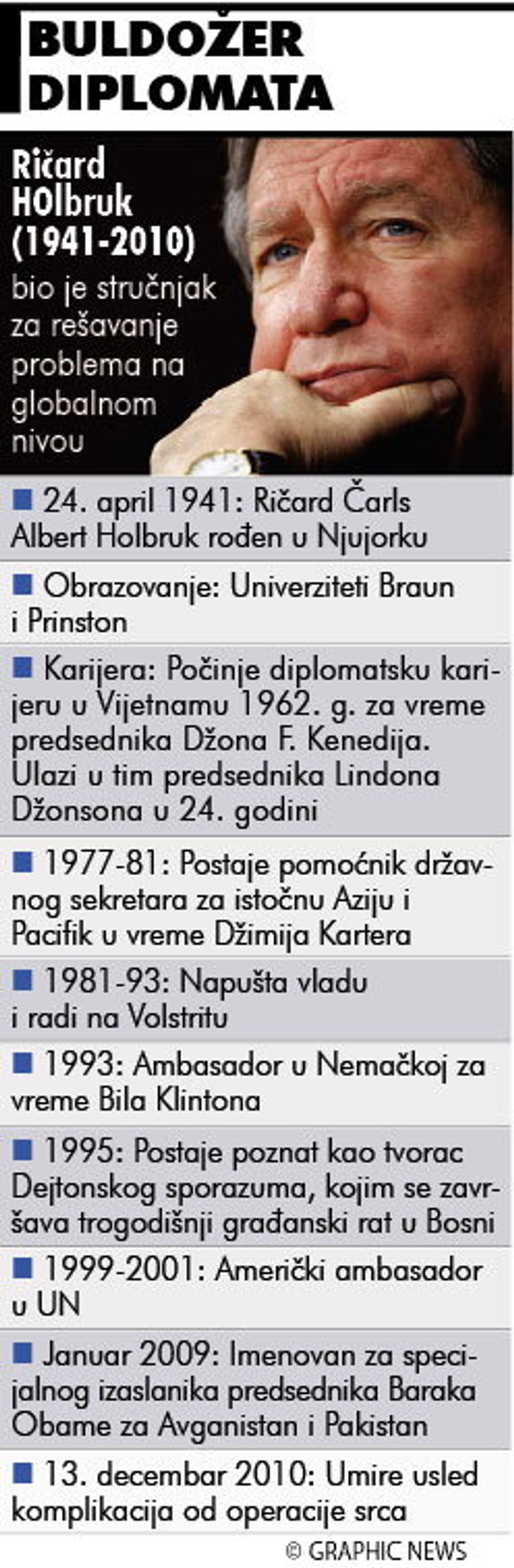 Ričard Holbruk, veteran američke diplomatije, preminuo je u ponedeljak uveče po lokalnom vremenu u bolnici u Vašingtonu od posledica pucanja srčane aorte. Igrom sudbine umro je na dan kada je pre 15 godina potpisan Dejtonski sporazum, diplomatski ugovor koji je smatrao svojim najvećim profesionalnim dostignućem.