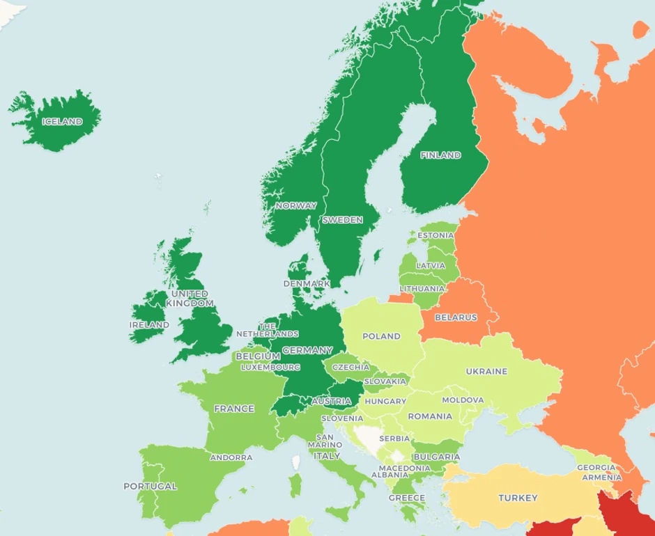 Među najdemokratskijim zemljama su i Holandija, Luksemburg, Nemačka, Velika Britanija, Austrija, Mauricijus (jedina afrička država), Malta, Urugvaj (jedina južnoamerička država) i Španija.