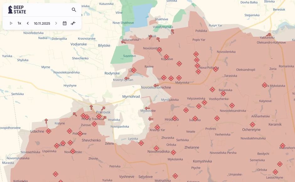 Prema izveštaju ISW od 11. novembra, Rusi su nedavno napredovali kod Pokrovska, ali stopa njihovog napredovanja u tom pravcu ostaje relativno spora. Rusi će verovatno zauzeti Pokrovsk i Mirnograd, ali će za to trebati više vremena i pretrpeće veće gubitke nego da su usmerili više resursa sa drugih mesta na frontu u ovom smeru.