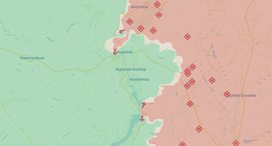 "Deep State", ukrajinska mapa lfronta koja prikuplja informacije iz otvorenih izvora, sugeriše da su ruske snage u nedelju proširile opkoljavanje Kupjanska sa zapada i počele da se infiltriraju u njegova zapadna predgrađa.