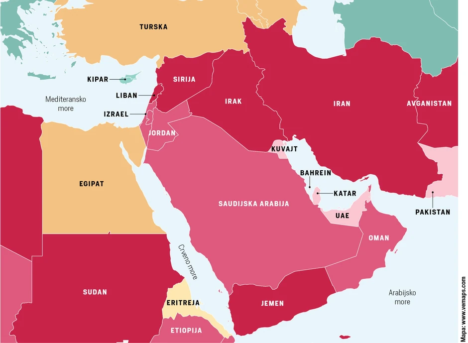 - SAUDIJSKA ARABIJA - nivo 6: Ne savetuje se putovanje zbog izveštaja o raketnim i napadima dronovima u regionu, a poseban oprez postoji otkad je postrojenje kompanije "Aramko" u Ras Tanuri pogođeno drugi put