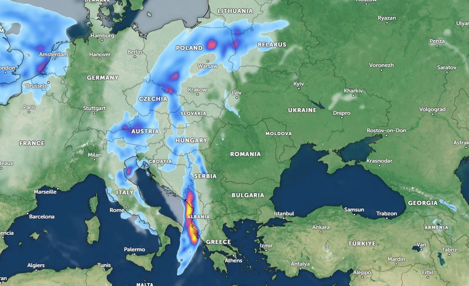 Oko 14 časova, prema projekciji sajta, stvoriće se "olujni bedem" od Baltičkog mora na severu Evrope, koja ide kroz Poljsku, Češku, Slovačku, Srbiju, Bosnu i Hercegovinu, Crnu Goru i Albaniju.