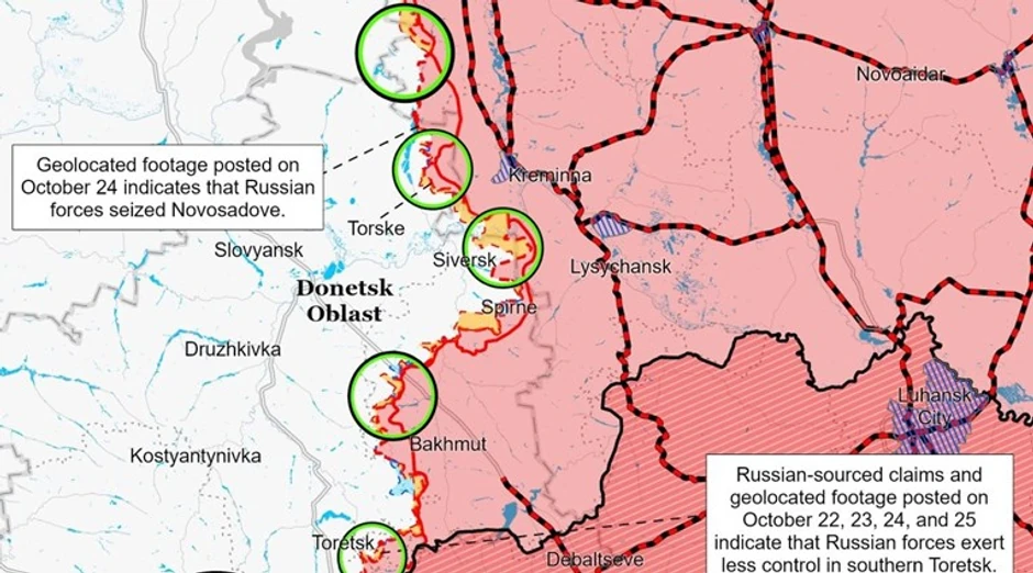 Međutim, 20. oktobra ruske trupe neočekivano su prešle kanal južno od Časiv Jara, stigavši do ivica grada. To sada dovodi glavne nabavne rute za ukrajinske snage u Časiv Jaru - puteve prema Torecku i Kostjantinivki - u opasnost.
