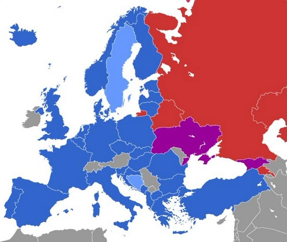 Izuzimajući neke države i entitete poput ruskog Kalinjingrada, plavi talas prelio se preko Atlantika i zapljusnuo Rusiju. Ukrajina – kojoj NATO obećava prijem nakon rata – bukvalno je jedna od poslednjih “tampon zona” između zapadne i istočne alijanse – Organizacije ugovora o kolektivnoj bezbednosti (ODKB) u kojem je Rusija.