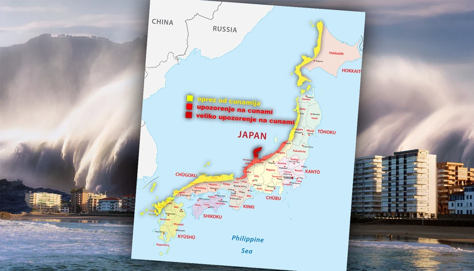 Objavljena je mapa zapadne obale Japana na kojoj su obeležene ugrožene oblasti sa različitim stepenima upozorenja na cunami.