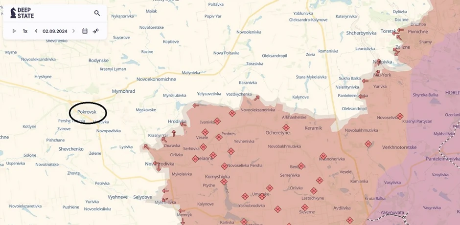 Ukrajinski “Telegram” kanal “Šrajk njuz”, koji je podelio mapu, izvestio je kako je rusko napredovanje u zoni Pokrovska, sela Njujorka, Avdijevke (Avdejevka) i Staromihajlivke bilo relativno postepeno od početka godine. Međutim, u avgustu su dobici Rusije – 240 kvadratnih kilometara – bili skoro pet puta veći od mesečnog proseka od 54 km2 u prvih sedam meseci ove godine.