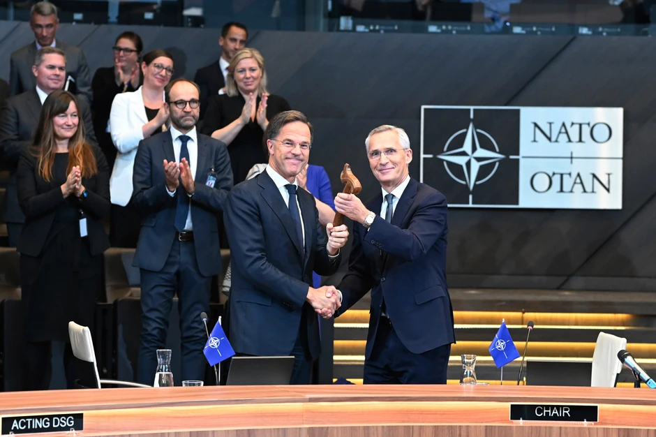Bivši generalni sekretar Alijanse Jens Stoltenberg predao je Ruteu ceremonijalni čekić, čime je obeležena primopredaja dužnosti.