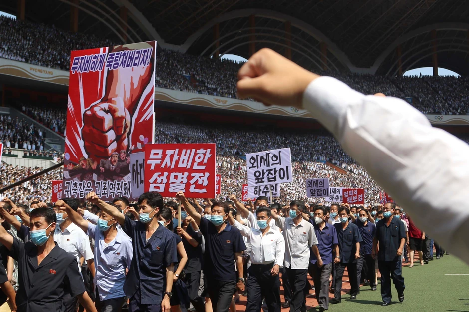 Fotografije koje je objavio list "Rodong šinmun" prikazuju stadion u Pjongjangu pun ljudi sa maskama protiv kovida, koji podižu pesnice u vazduh i drže natpise na kojima je pisalo "Iskorenimo američke imperijalističke osvajače" i "Celo kopno SAD je u dometu našeg udara".