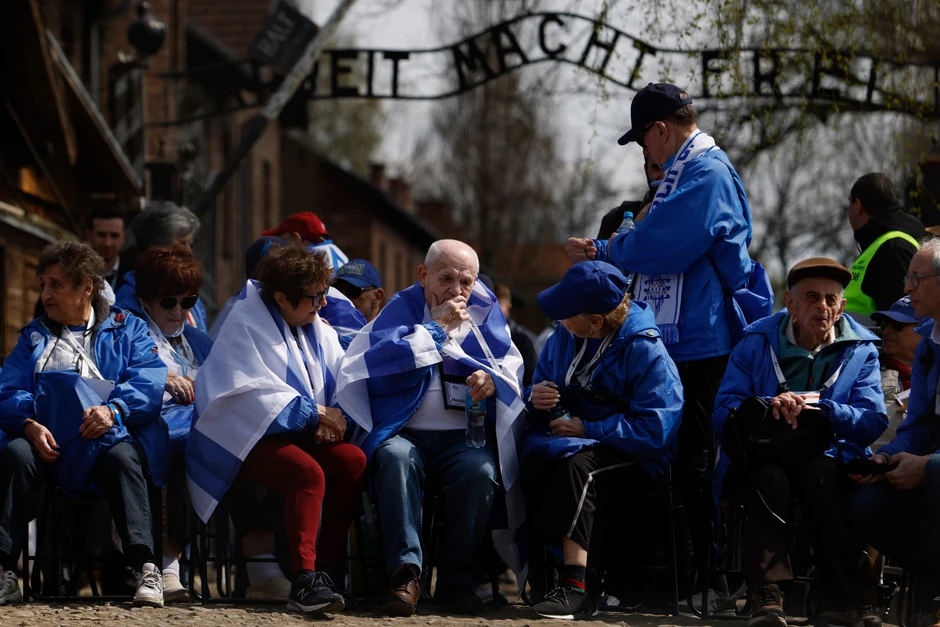 Preživeli, od kojih su neki bili ogrnuti zastavama Izraela, okupili su se uoči marša ispred kapije Aušvica i natpisa "Arbeit Macht Frei" (Rad oslobađa).