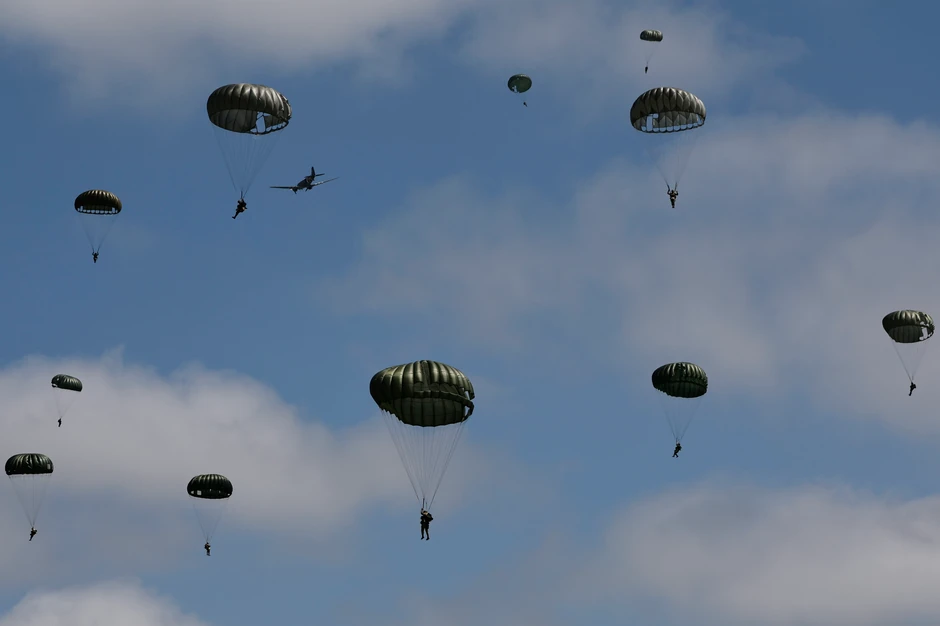 Iz tri transportna aviona C-47, oni su iskočili, a njihovi padobrani otvarali su se na plavom nebu, dok su ih okupljeni čekali uz pesme Glena Milera i Edit Pjaf.