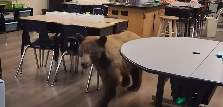 Nastavnica u jednoj školi u Kaliforniji ostala je u šoku kada je u učionici zatekla medveda kako gricka energetske štanglice koje su deo pribora učenika za slučaj zemljotresa.