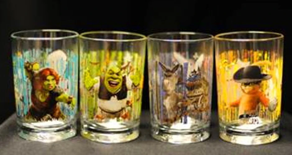 Čaše su prodavane po dva dolara u sklopu promotivne kampanje za animiranu komediju "Šrek srećan zauvek", čija je premijera u SAD bila 21. maja.