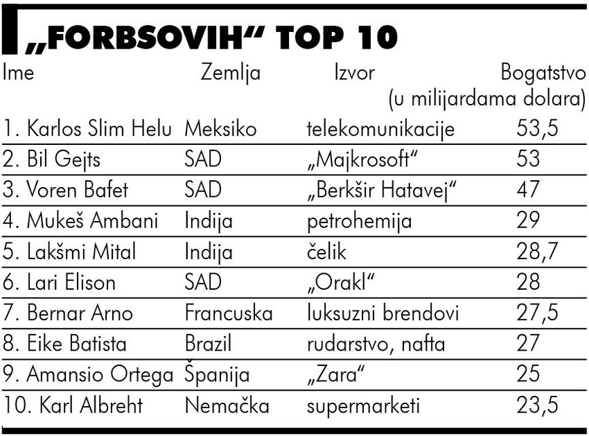 Karlos Slim Helu (70), meksički tajkun koji tvrdi da uživa u kvalitetnim cigarama, umetničkim delima i igrama bejzbol kluba Njujork Jenkiz, postao je prvi bogataš rođen izvan SAD koji je u poslednjih 16 godina stao na čelo liste milijardera magazina „Forbs“. Njegovo bogatstvo procenjuje se na 53,5 milijardi dolara, što je malo više od imovine Bila Gejtsa, osnivača kompanije „Majkrosoft“.